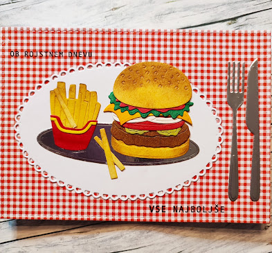Hamburger in pomfri sta priljubljeni hrani mladih in tudi manj mladih. Tako sta danes pristala tudi na dveh voščilnicah za rojstni dan. In ker še ravno poteka izziv na blogu The male room - food and drink, jo prijavljam tja.